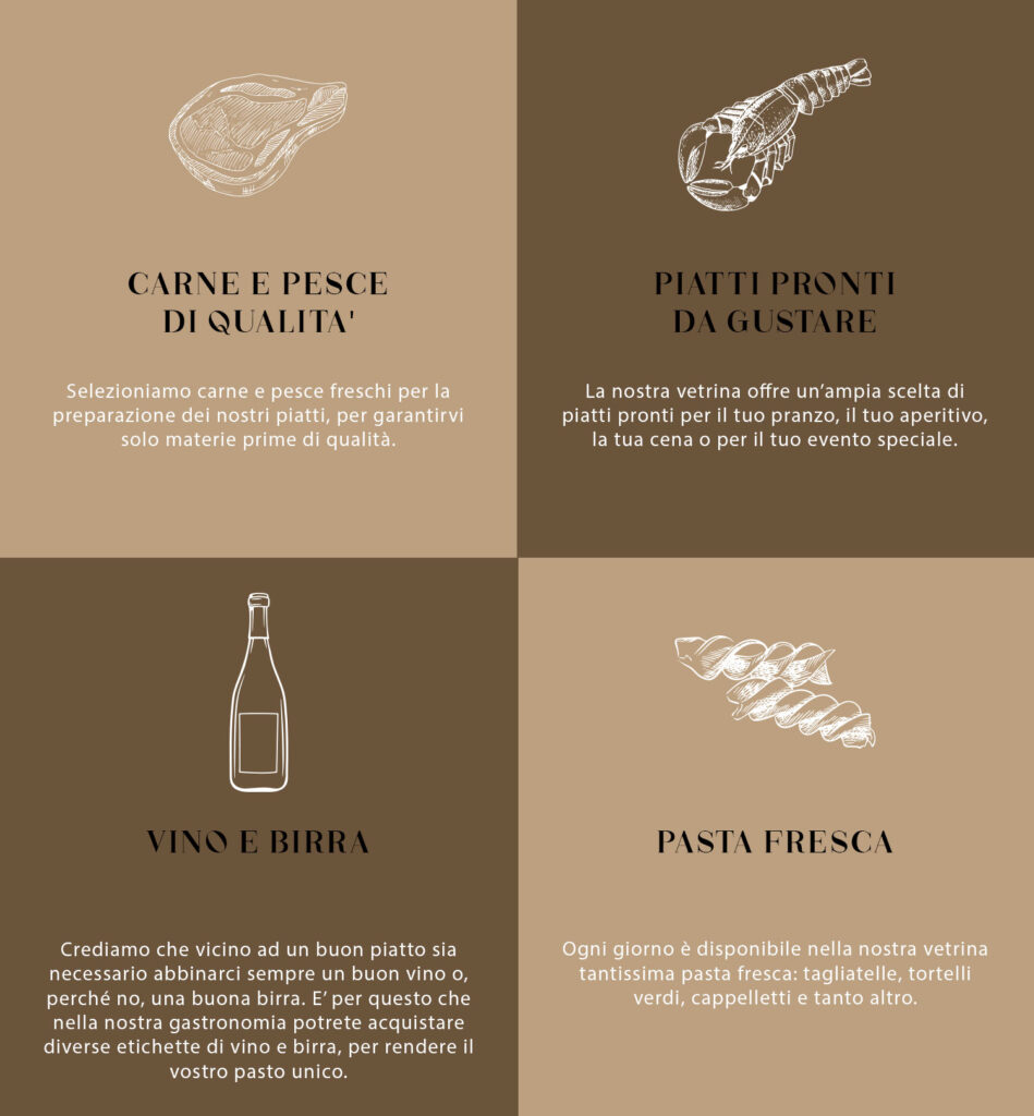 Il nostro menù è composto da piatti “fissi”, ovvero piatti pronti che puoi trovare ogni giorno nella nostra vetrina, e dai piatti fuori menù scelti di giorno in giorno dal nostro chef.